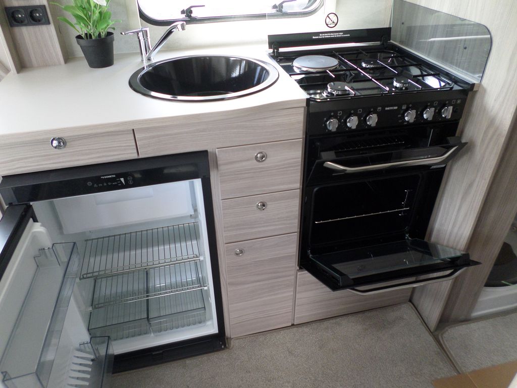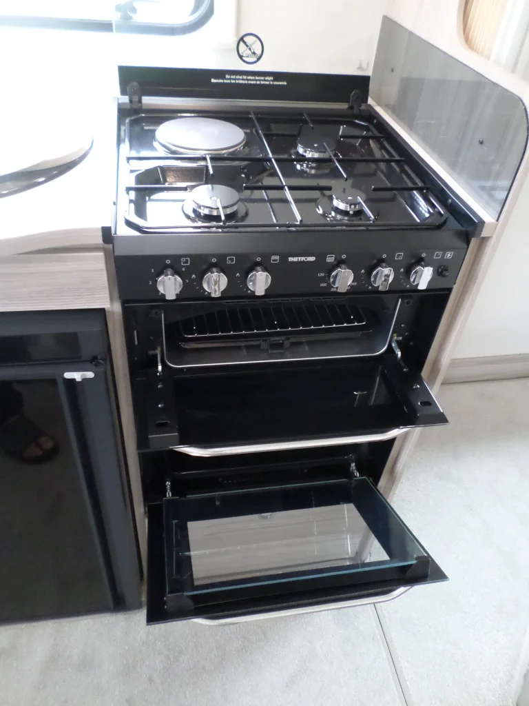 • Four Thetford K1520 MK2 noir brillant émaillé, grill et plaque de cuisson mixte gaz/électrique avec allumage piézoélectrique et plaque chauffante électrique 800 W, trois brûleurs à gaz avec couvercle en verre fumé.
